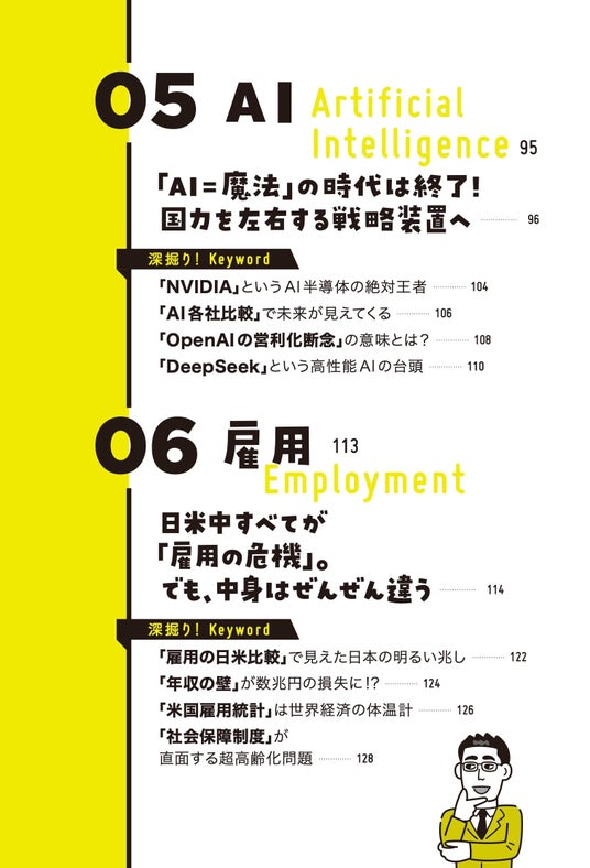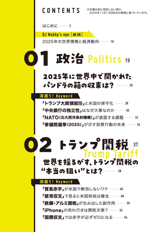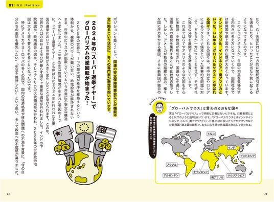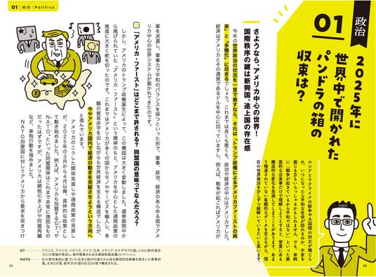 また、本書は2025年の主要ニュースを総ざらいした構成で、軽快な語り口による解説と、カジュアルなイラスト、デザインが特徴。