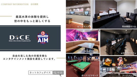 「DiCE」 は、2000 年より関東を中心に展開しているインターネットカフェです。高級感や清潔感などから、多くの女性のお客様にもご好評を得ています。豊富な雑誌・コミック、フリードリンクに加え、ソフトクリームに関しては「ソフトクリームに本気すぎるネットカフェ」として毎週違う味の提供や、他社とのコラボも行っています。グループ利用に最適な完全個室のVIPルームに加え、ダーツ・カラオケ・そしてeスポーツ等のアミューズメントコンテンツもお楽しみいただけます。「暇をつぶす」ネットカフェから「時間を作って通いたい」ネットカフェに。最高水準の体験を提供し、世の中をもっと楽しくするネットカフェです。