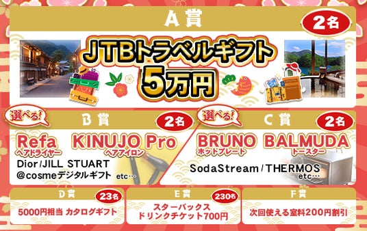 A賞:JTBトラベルギフトカード 5万円分(2名様)