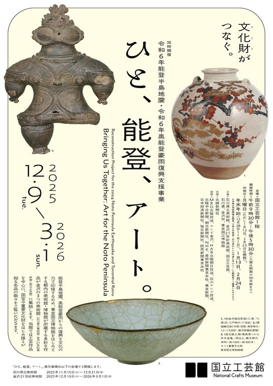 館内では「ひと、能登、アート。」を同時開催。国立工芸館の名品に加え、東京国立博物館所蔵の重要文化財《遮光器土偶》や《色絵月梅図茶壺》(仁清)など、貴重な作品をご覧いただけます。