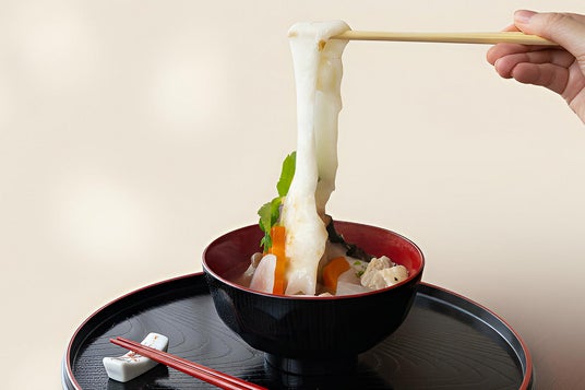 雑煮は、正月に神様へ供えた餅や食材を家族で分け合って食べる神事料理が起源とされています。餅を雑煮にして食べることは、年神様の恵みに感謝し、一年の健康と無事を願う、もっとも正式な食べ方のひとつ。マンゲツモチは煮ても煮崩れしにくく、もちもち感がしっかり残るため、だしとの相性も抜群です。