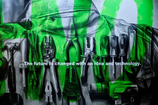 廣田氏を中心とした経営陣が先代のお父様をテーマにした3Fの壁画に対し、1階はハイテクノの次世代を担う若手メンバーが自ら議論し、方向性を決めました。彼らがたどり着いたキーワードは「今のハイテクノを超えていく」 。