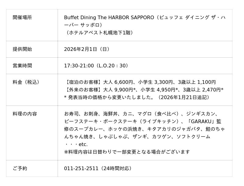 株式会社 アベストコーポレーション(代表取締役:松山 みさお)が運営するホテルアベスト札幌(支配人:山本 竜也、北海道札幌市中央区)は、2021年7月の開業以来初となるディナーバイキングを、2026年2月1日(日)から提供いたします。