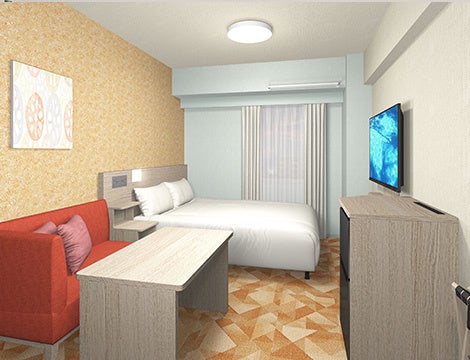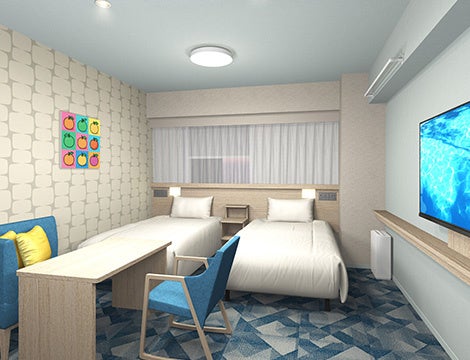 客室は、お一人様からグループまで幅広くご利用いただける広々とした15平方メートル のダブルルーム(ベッド幅150cm)と、ゆとりのあるツインルーム(ベッド幅110cm、最大4名)を中心に構成しており、当社グループホテルが大切にしている“1cmの快適性と機能性”を追求しています。全客室にサータ社製の快眠ベッドを導入するとともに、横になり足を伸ばしてくつろげるソファや、デスクワークやお食事にも便利な大きなテーブルを備え、あったら嬉しいところにコンセントを配置するなど、客室での時間をより心地よく快適にお過ごしいただける工夫を随所に施しています。