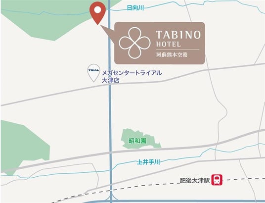 当ホテルは、熊本空港や熊本市、阿蘇エリアを結ぶ主要幹線・国道325号線沿いに位置しています。熊本空港から車で約10分、熊本市中心部から約30分、さらに九州縦貫自動車道「熊本インターチェンジ」からは、菊陽バイパスを経由して車で約15分と、県内外からのアクセスに優れています。また、空港連絡バスの発着点でもあるJR豊肥本線「肥後大津駅」へも車で約8分と、熊本駅方面をはじめ公共交通での移動にも適しています。
