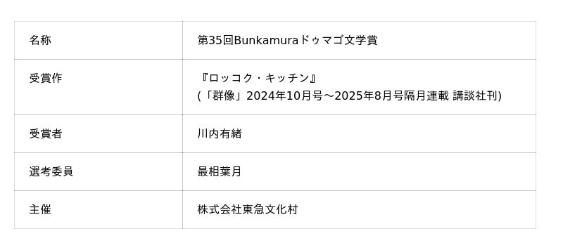 株式会社東急文化村(東京・渋谷)が1990年に創設した「Bunkamuraドゥマゴ文学賞」は、権威主義に陥らず、既成の概念にとらわれることなく、先進性と独創性のある、新しい文学の可能性を見出すことを目的としています。受賞作は毎年かわる「ひとりの選考委員」によって選ばれる点が特徴です。