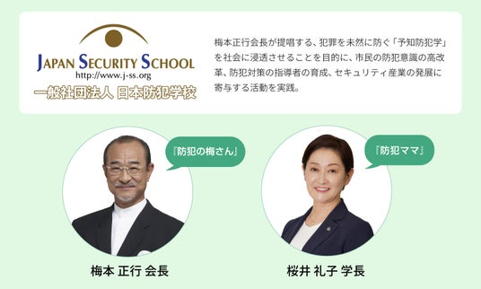 テレビでもお馴染み、日本防犯学校の「防犯の梅さん」こと梅本正行会長と「防犯ママ」こと桜井礼子学長。