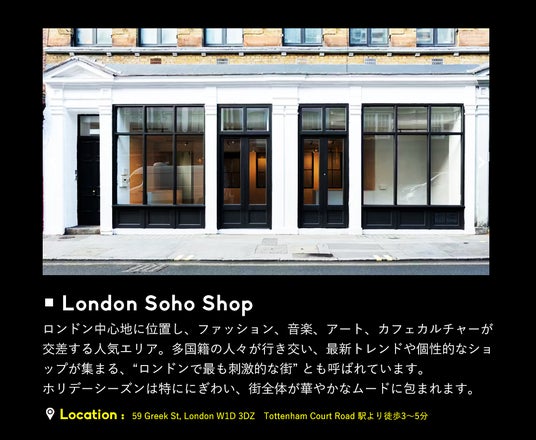 ロンドン・Sohoは、ファッション、音楽、アート、食文化など、多国籍のカルチャーが絶えず行き交うエリア。世界中からクリエイターや感度の高い人々が集い、自由で創造的なエネルギーが街に満ちています。