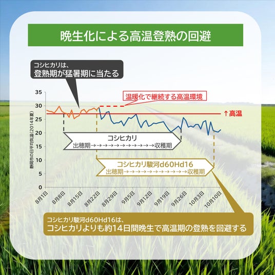 コシヒカリの登熟期が猛暑期に当たるのに対して、コシヒカリ駿河d60Hd16は約14日間晩生で高温登熟を回避することができます。