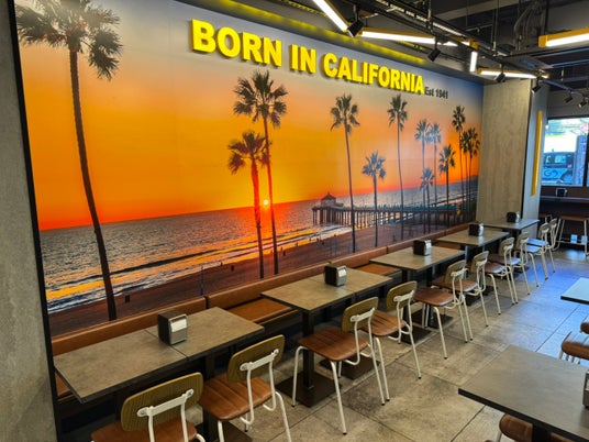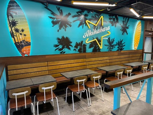カールスジュニア最新モデルを導入した内装は、まるでカリフォルニアのビーチサイドで食事をしているかのような空間を体験できるものです。サーフボードやヤシの木のビーチサイドがデザインされ、居住性もアップしています。