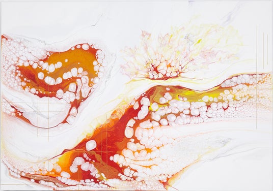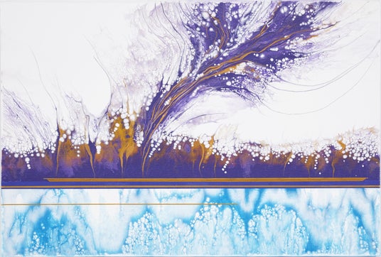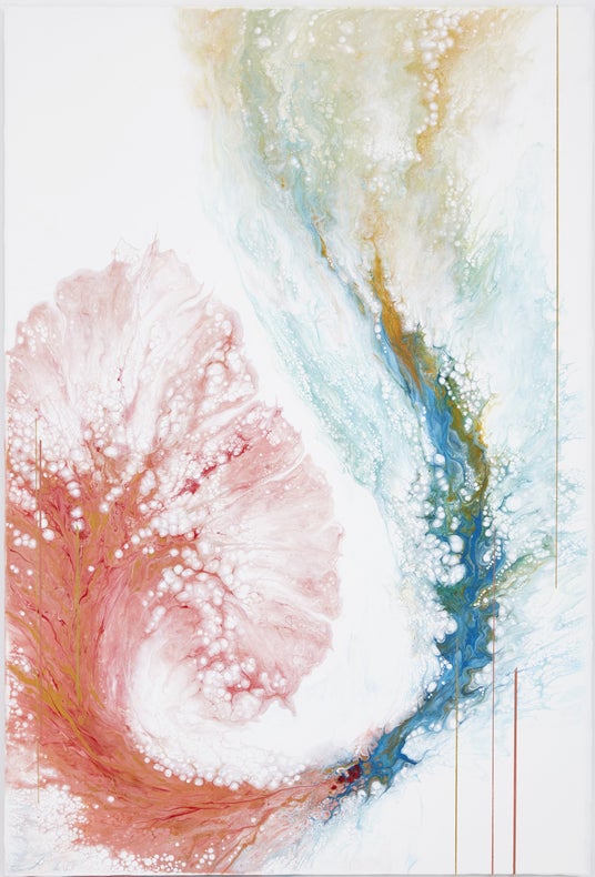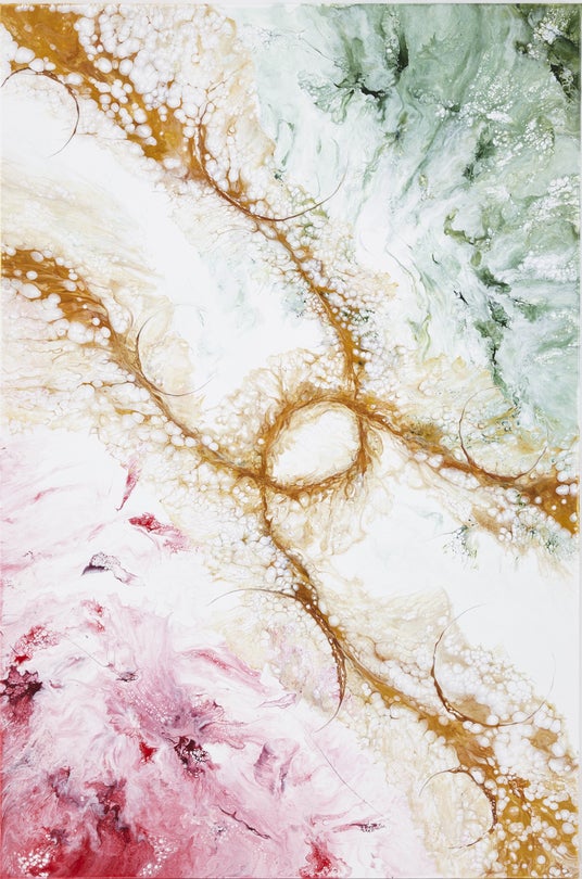日々の中で奇跡のまばたく瞬間と、限りない不思議な美しさの偶然性を生みだすポーリングアートの世界を、キャンバスの上で表現いたしました。 轟 悠(藏人)