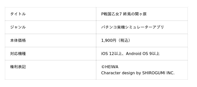 スマートフォンゲームアプリの企画開発・サービスを手がけるコムシード株式会社(本社:東京都千代田区、代表取締役社長CEO:塚原 謙次、証券コード:3739、以下コムシード)は、株式会社平和のパチンコ機『P戦国乙女7 終焉の関ヶ原』のスマートフォンゲームアプリを、本日より各アプリマーケットにて販売開始いたします。