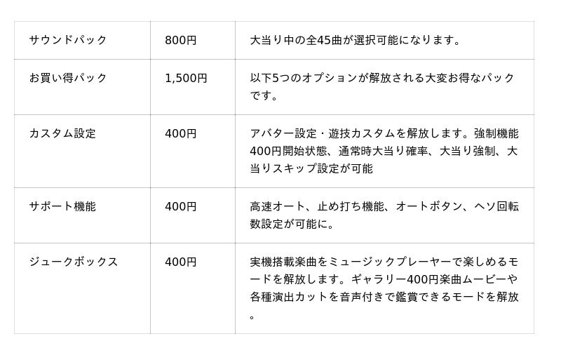 - ジュークボックス」「ギャラリー」 :実機搭載楽曲をミュージックプレーヤーのように楽しめる「ジュークボックス」や、楽曲ムービー・各種演出カットを音声付きで鑑賞できる「ギャラリー」を搭載しました。※ご利用には別途オプションの購入が必要です。