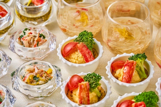 蟹を炙ることで香ばしさと旨味が増した一皿をじっくりとお召し上がりいただけます。また、蟹を使ったスモールポーションの一品一品は、美しい盛り付けで、お好みのものを豊富にお楽しみいただけます。さらに、ライブキッチンでは、料理長が試作を重ねて完成させた手作りの蟹クリームコロッケを提供いたします。カニの身とホワイトソースの絶妙なバランスが特徴です。
