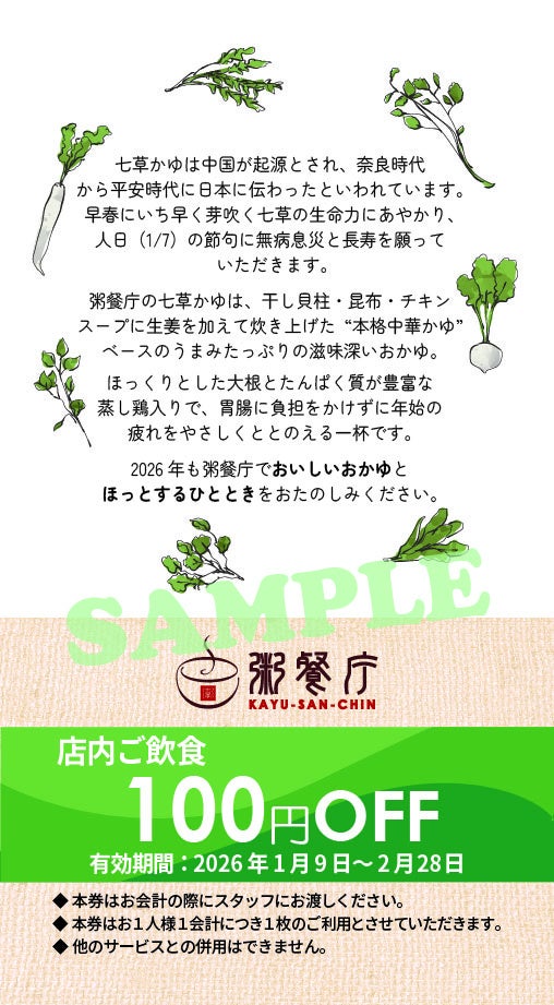 ■七草の日は粥餐庁へ!次回以降使えるお得なクーポン付き