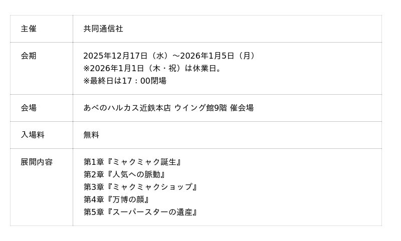 12月17日(水)~2026年1月5日(月)「ミャクミャク」の誕生から閉幕まで、人気の変遷と活躍を報道写真でたどる写真展を実施。