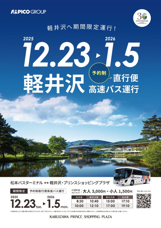 2025年12月23日(火)~2026年1月5日(月)の期間限定で、軽井沢・プリンスショッピングプラザと長野県松本市(松本バスターミナル)を結ぶ高速バスが初運行!乗り換えの負担なく軽井沢に簡単にアクセスができます。お買い物帰りの荷物が増えても安心です。ご家族やご友人とのおでかけに、ぜひご利用ください。ご予約や運行についての詳細は以下をご確認ください。