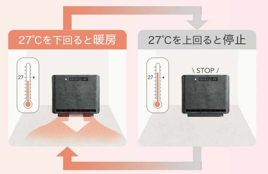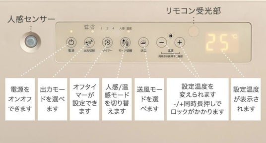 本製品は、人感センサーと室温センサーの2つを搭載しております。人感センサーは人の動きを感知し、自動で運転のON/OFFを切り替えることにより、消し忘れ防止になり、また効率的に暖まることが可能です。