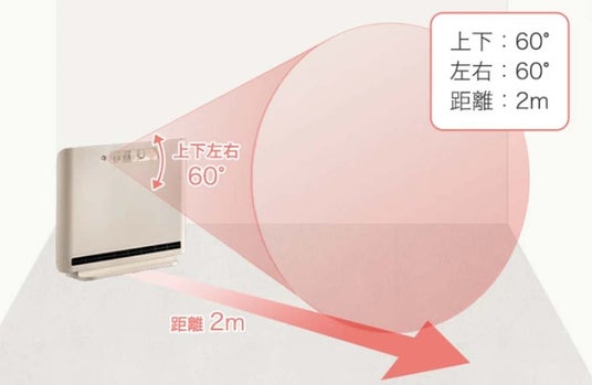 前面の操作パネル横にセンサーを設置しており、上下左右60度、距離2mの範囲がセンサー感知範囲です。