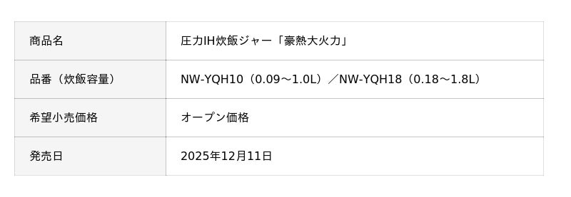 象印マホービン株式会社は、近年の訪日外国人の増加を背景に、ツーリストモデル(海外仕様品)の圧力IH炊飯ジャー「豪熱大火力」シリーズ(NW-YQH型)を2025年12月11日より発売いたします。