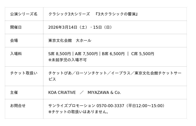 『春の幕開けを華やかに彩る、3つのクラシックの響演』クラシック3大シリーズを2026年3月14、15日に東京文化会館で開催決定