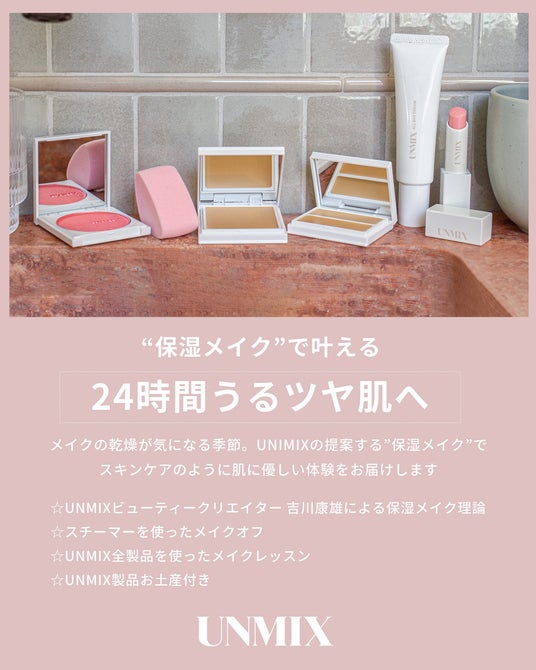 UNMIXビューティークリエイター 吉川康雄氏によるセミナーのほか、スチーマーによるメイクオフをご体験いただけるなど、メイクの乾燥が気になる季節にぴったりの内容です。