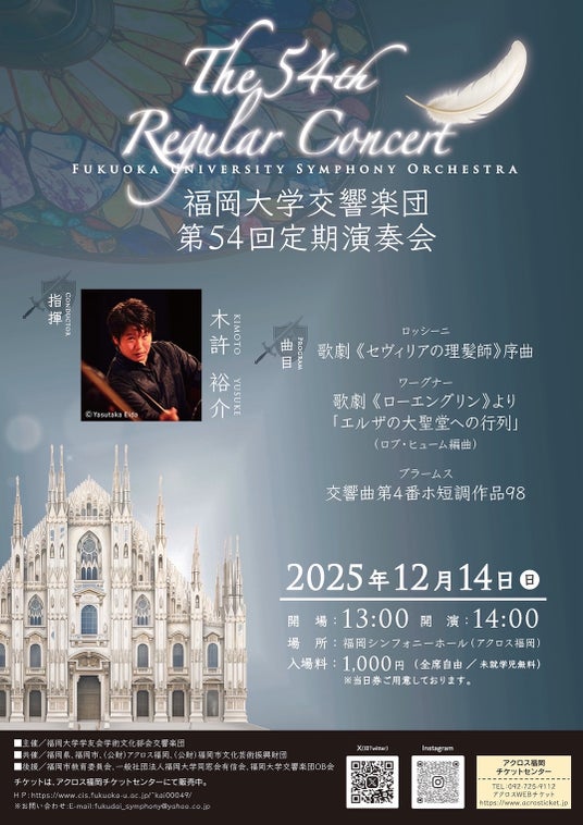 12月14日(日)に、交響楽団が「第54回福岡大学定期演奏会」を開催します。プログラムは、あえてバリエーション豊かな構成にすることで、飽きのこない内容に工夫しています。学生らしいパワフルな演奏を、会場でぜひ体感してください。