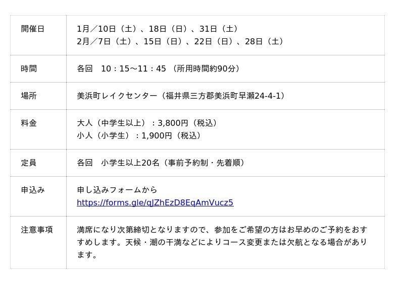 福井県美浜町では、2026年(令和8年)1月から2月にかけて、三方五湖観光の拠点施設「美浜町レイクセンター」において、冬の三方五湖に飛来する渡り鳥を専門ガイドとともに観察する「野鳥観察クルーズ」を開催します。 エンジン音のない静かな遊覧船で湖面を進みながら、日本野鳥の会会員による解説付きで本格的なバードウォッチングが楽しめる、冬限定の特別クルーズです。