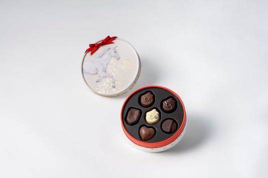 年の始めに白馬を見ると一年の邪気が払われるとされた故事にちなみ、白馬をデザインしたパッケージに、馬に乗ったレディ・ゴディバをデザインしたチョコレートを詰め合わせました。