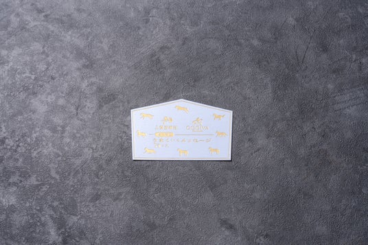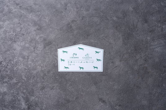 レディ・ゴディバをデザインしたホワイトチョコレートに、淡いブルーのハートが付いていたら、大当たり。とってもうまくいく一年となるでしょう。上賀茂神社のメッセージが書かれた、“9頭の馬が行く”で“うまくいく”と、シャレの効いた絵馬形カードは、午年の縁起物としてお持ちください。