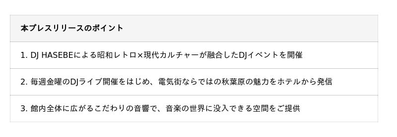ノーガホテル秋葉原は、「Spark your GEEK MIND」のテーマのもと、秋葉原という街の魅力をホテルを通じて発信し、感性を刺激する体験を提供しています。2020年の開業以来、新進気鋭のアーティストによる作品展示や音楽イベント、地域とのコラボレーション企画など、多彩なカルチャーを取り入れた取り組みを展開しており、館内にはハイエンドな音響を備えた5つのコンセプトルームをはじめ、こだわりの音響設備を随所に設置。さらに、毎週金曜日にはレストランにてDJライブを開催し、音楽を通じてゲストと街をつなぐ特別な時間を演出しています。