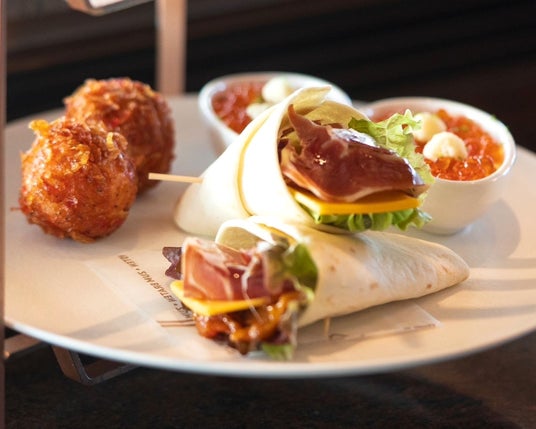 ホテル最上階にあるインターナショナルブラッスリー KUNSEIのシェフがご用意するセイヴォリーは、なめらかなカリフラワームースに、鱒子の旨みと爽やかなピクルスを添えた一品や、餅粉で包んだ海老団子を、香ばしい桜エビの衣でカリッと揚げました海老尽くしのフライ、そしてバスク地方の野菜煮込み”ペピラード”と生ハム、チーズをトルティーヤで巻き上げた、彩り豊かなロールです。
