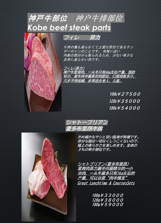 神戸牛の赤身ステーキのみでしたら、何と破格の100g3500円です。正真正銘の神戸牛ですよー。是非たくさんの日本人の方にも日本が誇る神戸牛をリーズナブルに食べていただきたいと思います。