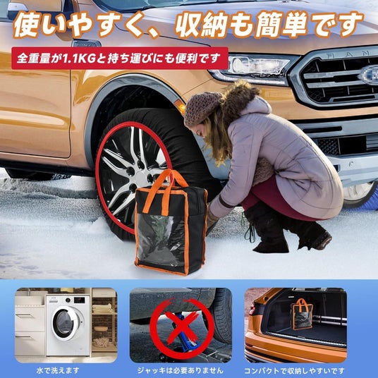 重い金属チェーンを組み立てる時代は終わりました。本品は、まるでタイヤに「靴下」を履かせるだけの簡単装着。ジャッキを使わず、工具も不要。寒い中、手を汚すことなく、たった3分で準備完了です。力に自信のない方、女性ドライバーでも安心してご使用いただけます。