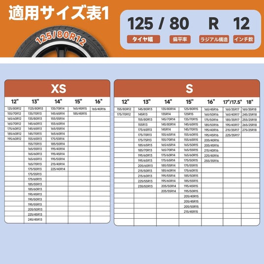 【サイズ選びは最重要】 製品詳細ページのサイズ対応表で、ご自身のタイヤサイズ(例:205/55R16) を必ず確認の上、適合するサイズをお選びください。6種類のサイズでほとんどの乗用車に対応しています。