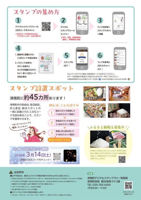新潟県津南町では、町内の商業施設の周遊促進を目的としたデジタルスタンプラリー 「ぐるっとスタンプまちめぐり つなんの旅帳(冬編)」を開催いたします。こちらの企画は2025年秋の開催に続く第2弾となり、冬編の開催期間は2025年12月13日(土)から2026年3月15日(日)まで。2026年3月14日(土)開催の「つなん雪まつり」の会場もスタンプ設置場所の1つとなります。