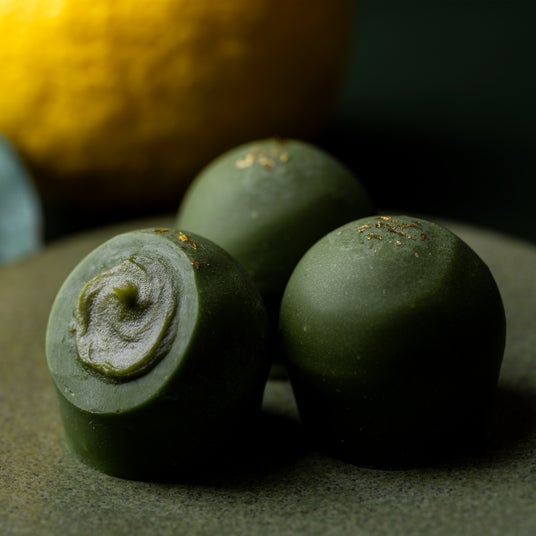 二つ目の「抹茶×京の柚子」では、抹茶のまったりとした旨みとコクに水尾の実生柚子の爽やかな香りと上品な酸味を合わせた、和の趣を感じさせる繊細な味わい。こちらはノンアルコールながら、抹茶と柚子の香りが穏やかな余韻をもたらし、心地よい後味を感じさせる大人のチョコレートです。