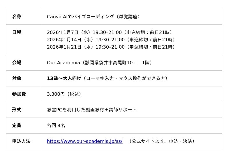 10代向けデジタル人材育成サービス『TechHigher』を運営する株式会社エクシード(本社:東京都渋谷区、代表取締役:澤部愛子)は、ライセンス提携校である静岡県袋井市のプログラミング教室「Our-Academia」(代表:大場康輝)において、生成AIと共創するアプリ開発体験「Canva AIでバイブコーディング」単発講座を初開催することをお知らせします。