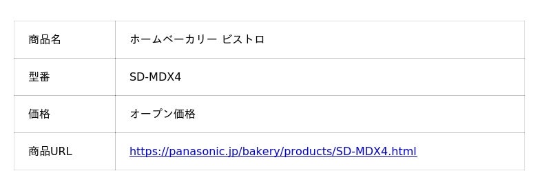 <商品情報>ホームベーカリー ビストロ SD-MDX4