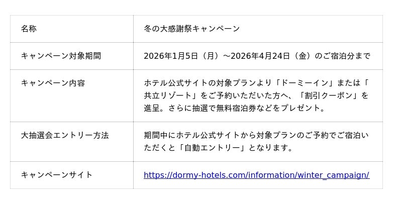 全国でビジネスホテル「ドーミーイン」やリゾートホテル「共立リゾート」を運営する株式会社共立メンテナンス(以下、共立メンテナンス/代表取締役社長:中村 幸治/本社:東京都千代田区)は、2026年1月5日(月)宿泊よりホテル公式サイトからのご予約を対象とした限定企画「冬の大感謝祭キャンペーン」を実施いたします。ドーミーインと共立リゾートが贈る特別なキャンペーンで、この冬のご旅行を、もっと楽しく、もっとおトクに。この機会にぜひご活用ください。