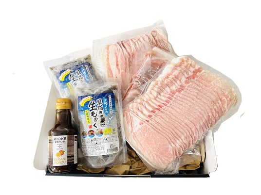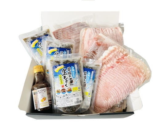 【ちゅらゆーな】伊是名島産早摘み生もずくとキビまる豚(福まる農場(株))がコラボした「からだにやさしい」ギフトセットを新発売!