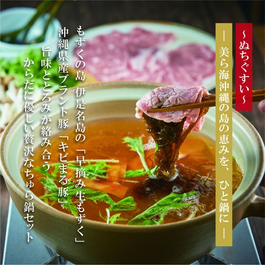 「ちゅらなべ」ギフトセットは、本島北部やんばるの離島伊是名島で期間限定収穫されるもずくの新芽で独特のヌメリとコシのある「早摘み生もずく」と本島南部八重瀬町でこだわりの生産方法で飼育される上品な甘味と肉質の「キビまる豚」をセットにした豪華なオリジナル鍋セット商品です。