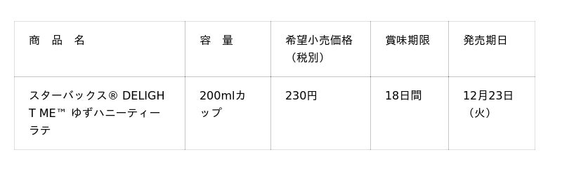 スターバックス・コーポレーション(本社:米国 シアトル、CEO:ブライアン・ニコル)と、サントリー食品インターナショナル株式会社(本社:東京都、社長:小野真紀子)は、スターバックスのチルドカップシリーズより「スターバックス(R) DELIGHT ME(TM) ゆずハニーティーラテ」を、12月23日(火)から期間限定で発売します。
