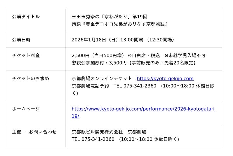 講談『豊臣デコボコ兄弟がおりなす京都物語』開催について