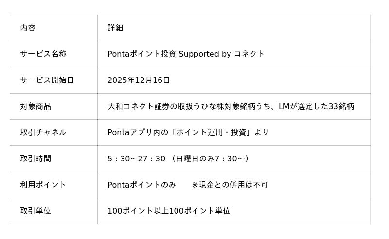 株式会社大和証券グループ本社(代表執行役社長 荻野 明彦)の子会社である、大和コネクト証券株式会社(代表取締役社長 大槻 竜児、以下「大和コネクト証券」)は株式会社ロイヤリティ マーケティング(代表取締役社長 勝 文彦、以下「LM」)が提供する、国内最大級の会員基盤(1億2,416万人/2025年10月末日時点)を有する共通ポイント「Ponta」の公式アプリ「Pontaアプリ」内で、Pontaポイントをつかって株式を購入できるサービス「Pontaポイント投資 Supported by コネクト」(以下「本サービス」)の提供を開始しましたのでお知らせします。