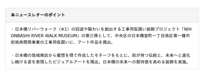 この度の仮囲いの活用を通して大規模工事期間中における街の賑わいを創出することで、魅力ある日本橋の街づくりをより一層推進してまいります。