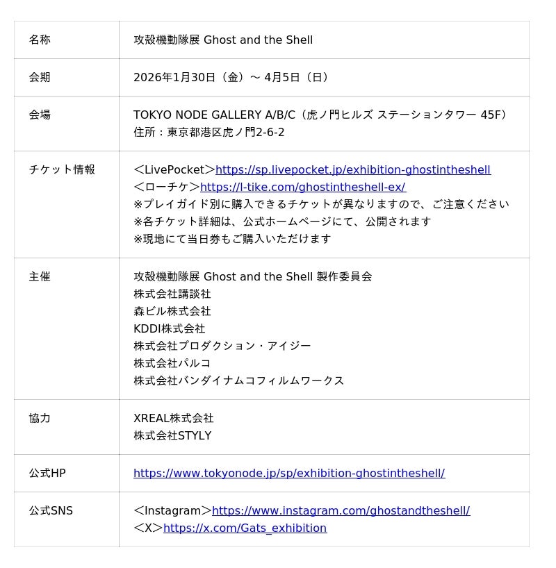 攻殻機動隊展 Ghost and the Shell 製作委員会(株式会社講談社、森ビル株式会社、KDDI株式会社、株式会社プロダクション・アイジー、株式会社パルコ、株式会社バンダイナムコフィルムワークス)は、2026年1月30日(金)から4月5日(日)まで、虎ノ門ヒルズの情報発信拠点「TOKYO NODE(東京ノード)」にて『攻殻機動隊展 Ghost and the Shell』を開催いたします。