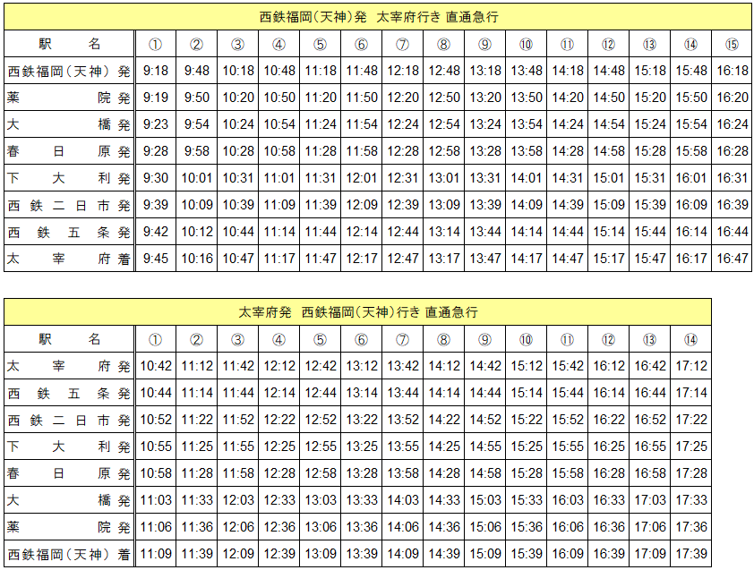 【運行本数】 1日29本(西鉄福岡(天神)駅発15本、太宰府駅発14本)