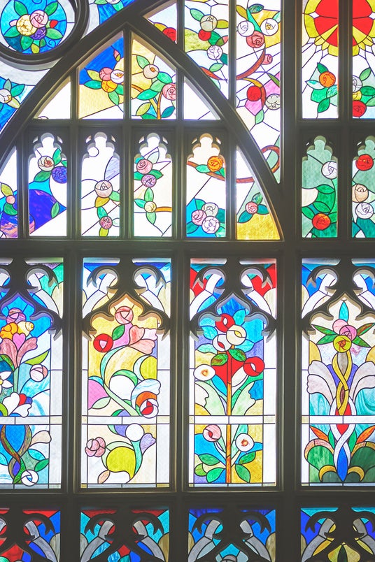 ステンドグラス越しに柔らかな光が差し込む大聖堂