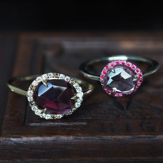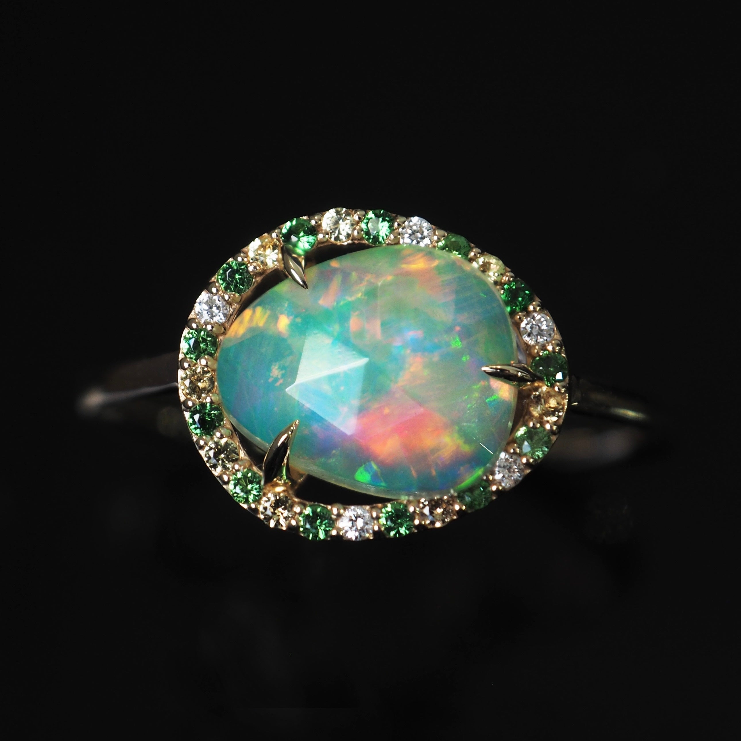「テラ」は、宝石が生まれ持つ形や表情をそのまま活かし、周囲には小さな宝石を一つひとつ丁寧に配しました。石の輪郭に沿うように取り巻かれたフォルムは、整えすぎることなく、自然な起伏と奥行きを感じさせます。中央の宝石と周囲の石との組み合わせはすべて異なり、配色や留めのバランスも一点ごとに調整しております。留めの角度や高さ、爪の本数や向きに至るまで細やかな工夫を重ね、光を取り込みながらも軽やかな印象に仕立てました。